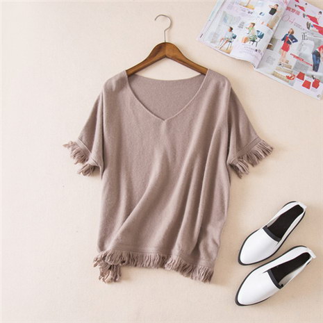 V领流苏袖口下摆 大码蝙蝠袖针织衫打底毛衣